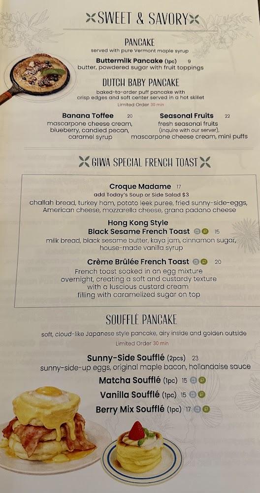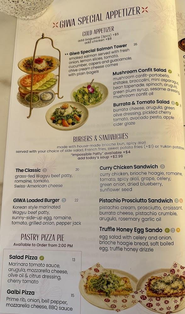 GIWA's menu shines with eclectic dishes that reflect its unique culinary style. Breakfast and brunch items feature a harmonious blend of Korean and Californian flavors. Options like Chicken and Waffles stand out, fusing comfort and creativity.